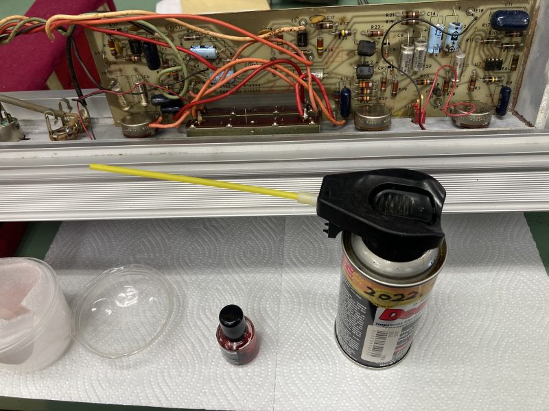 2025.08.21お客様より音色調整の御依頼を頂きましたので、作業を行いました。作業前にプリアンプの動作状況を確認すると、ボリュームやスライダーにガリが出ていましたので、Caigの原液とスプレーでメンテナンスしておきました。