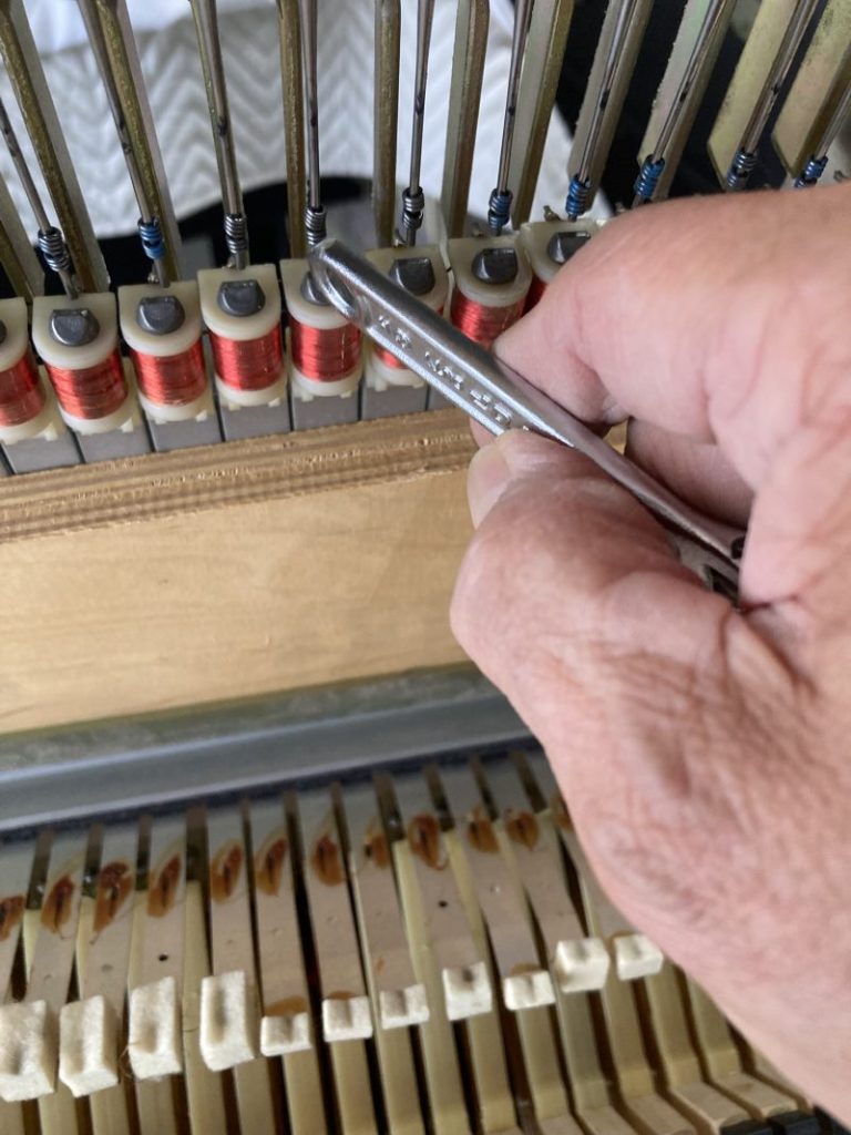 午後からはボイシング調整を行いました。アタックポイントがかなり大幅にずれていたので、調整に手間がかかりました。加えてトーンジェネレーターの固定用スクリューが固着して、スクリューを緩めてもトーンジェネレーターが動かない物が幾つも有り、一度2つのスクリューを全て緩めた状態にしてから再度締め込むと言う作業をしました。