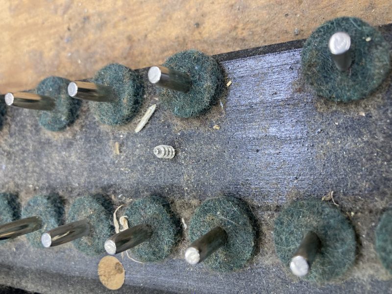 ピン磨きの作業を終えて、これから鍵盤をセットして行きます。