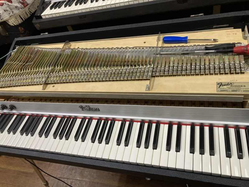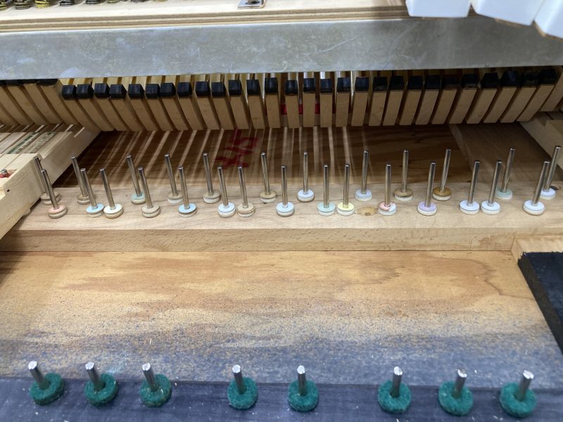 次にバランスピン磨きを行います。この作業は鍵盤のタッチをスムーズにする為の作業ですが、こちらのFender Rhodesは鍵盤の形状が後期モデルとは違う為、鍵盤が重いです。それでも、少しでもスムーズに動いてくれるように作業します。