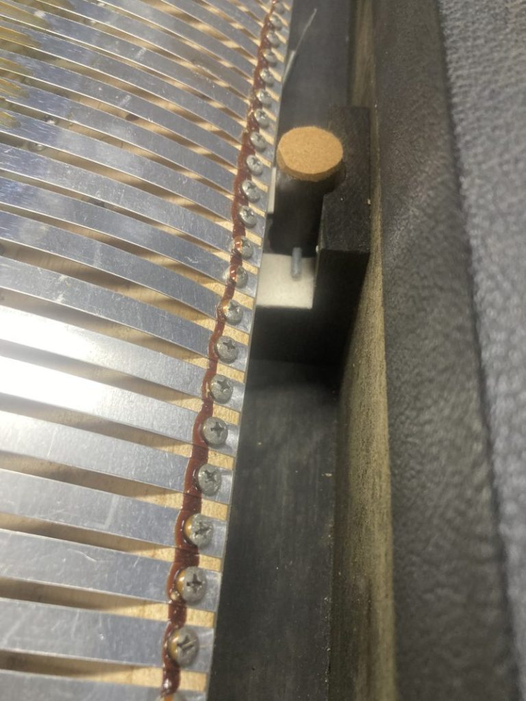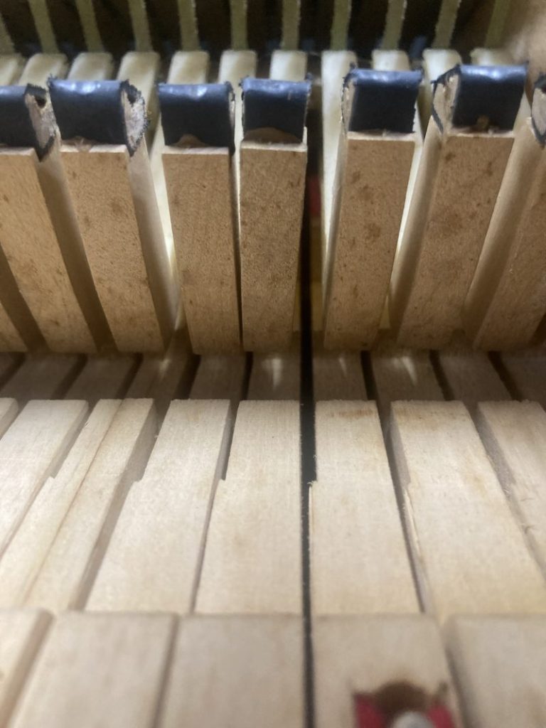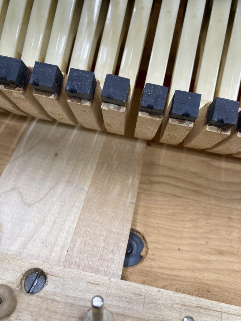KEYBEDの位置も、本来の位置からずれているようです。拍子木の手前にスペーサーとしてクッションフェルトがかんでありました。