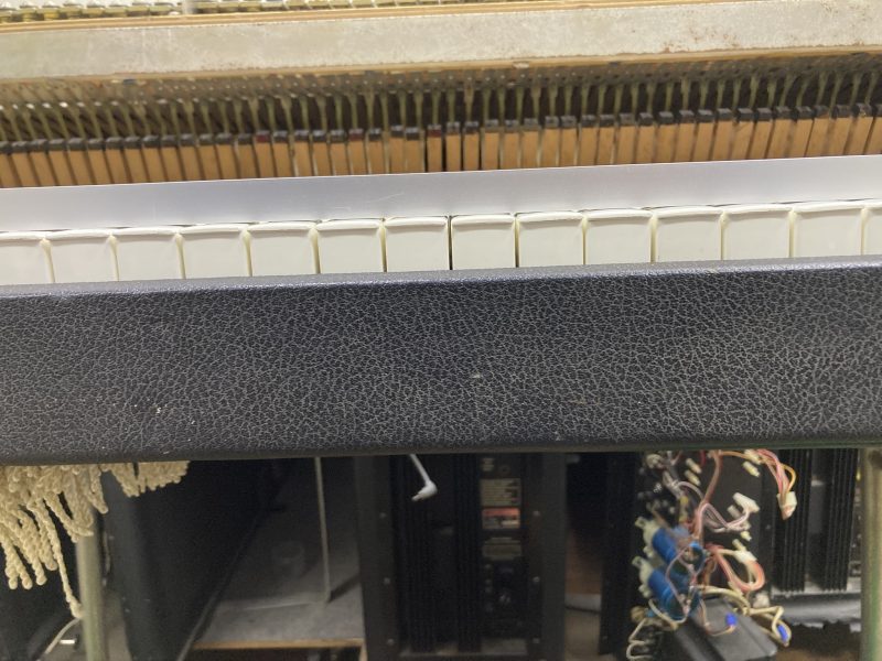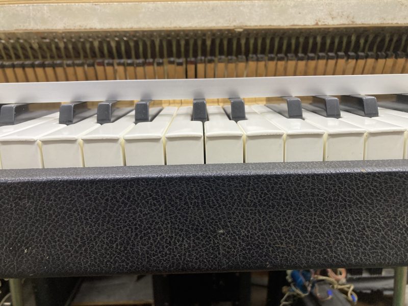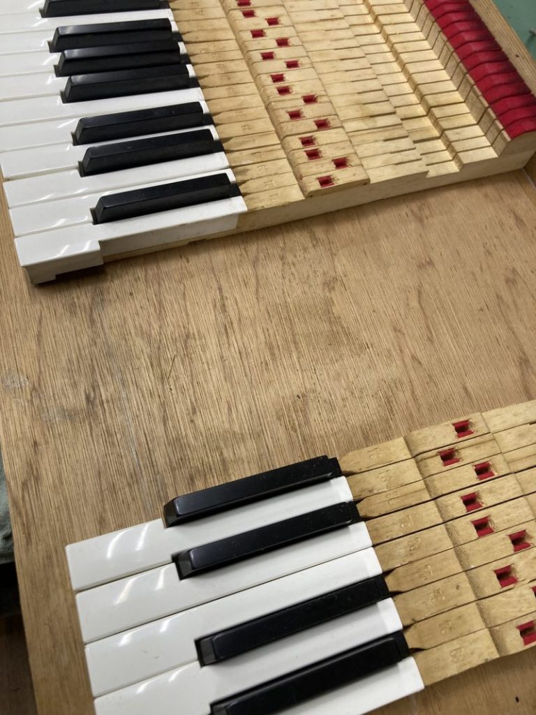2025.12.19今日は一日かけて、鍵盤整調を行いました。中音部が大きく下がっていたので、アコースティックピアノの調整の時に使う手法で、おさ(キーベッド)の下に名刺を挟み込んでおさの中央部分を持ち上げる手法を使いました。