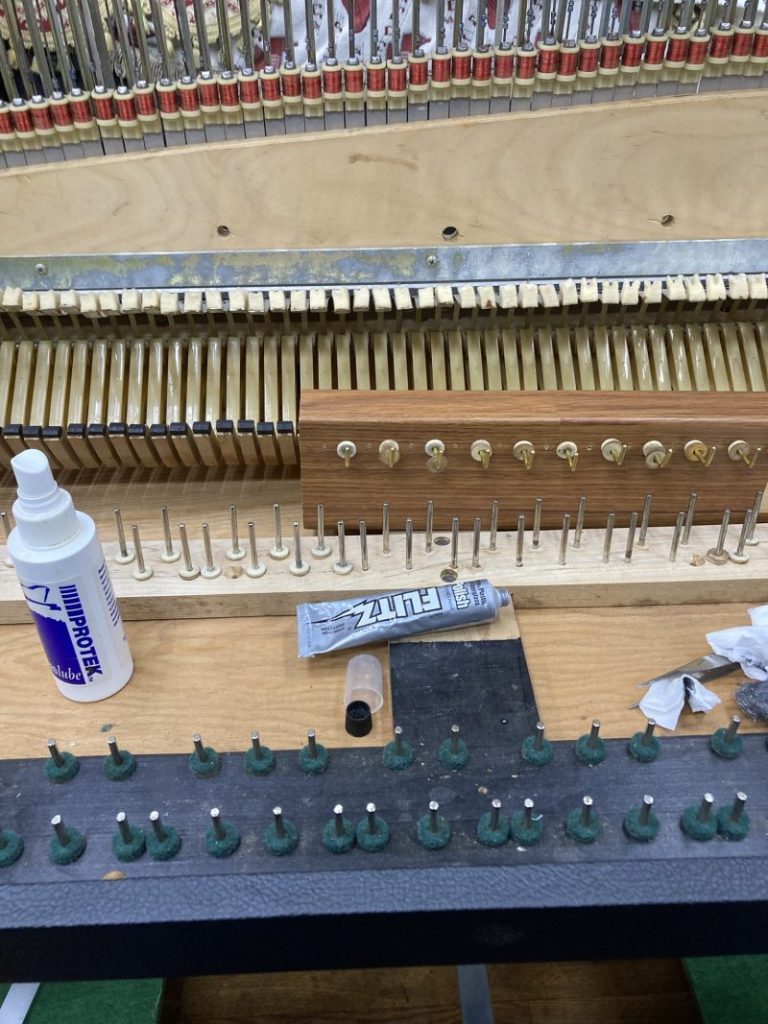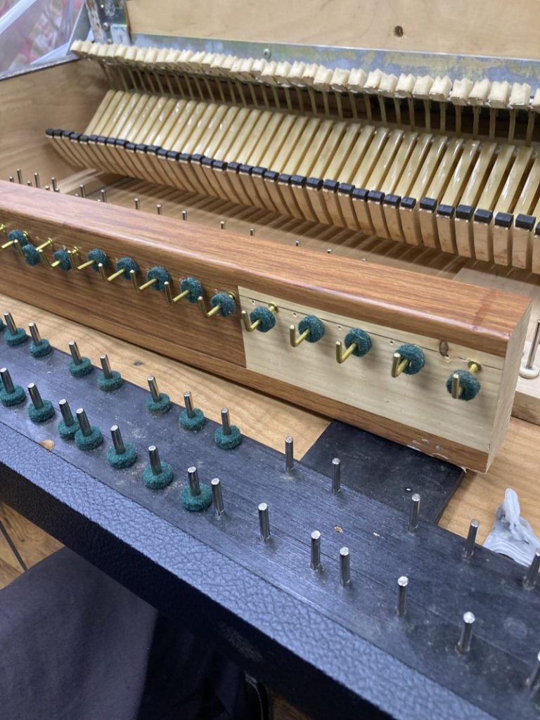2025.07.15内部調整の一環として、バランスピンとフロントピン磨きを行いました。この作業は鍵盤動作に大変影響する内容です。特にバランスピンは鍵盤の動作と重さに亘って影響しますので、地道な作業ですがしっかりとやっておきます。ピンの根元にサビが発生しているものが幾つか有りましたので、こちらはサビ落としも行っておきました。
