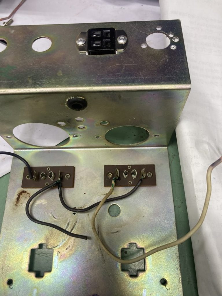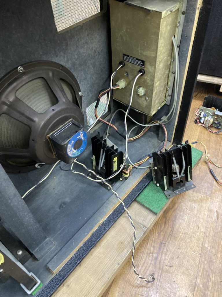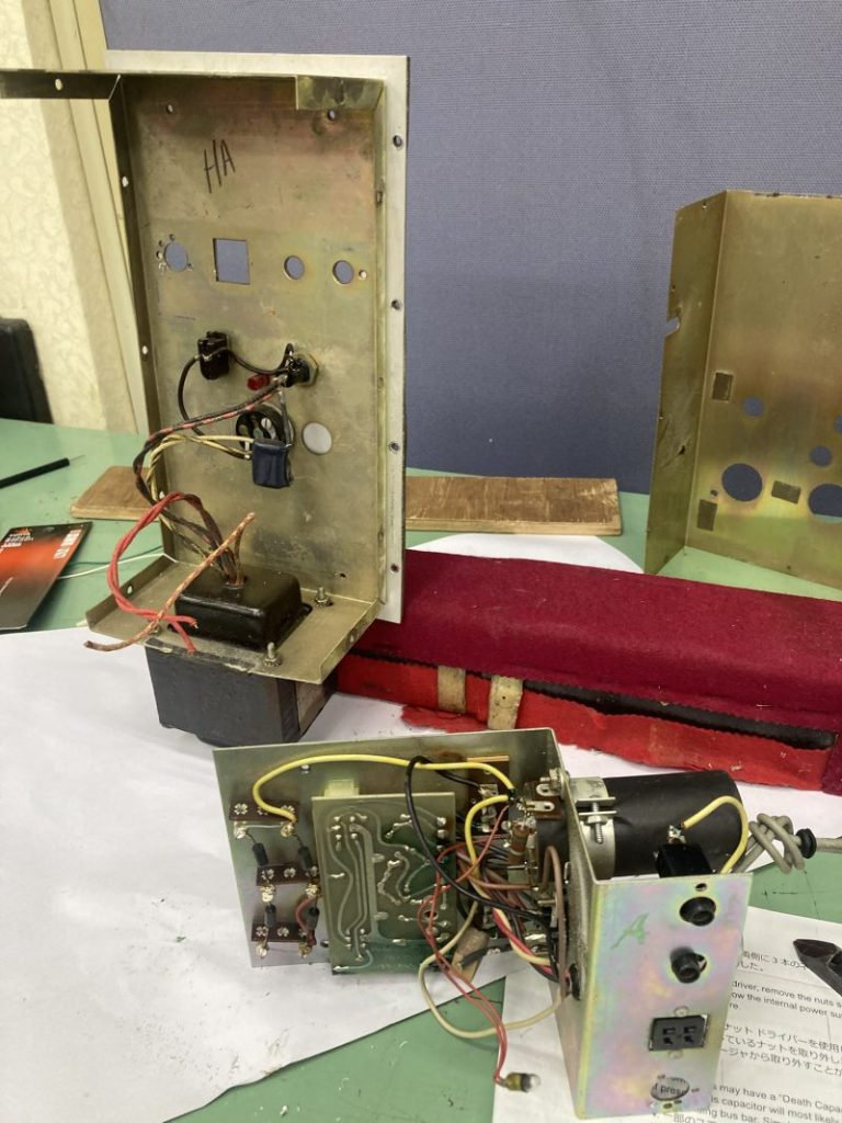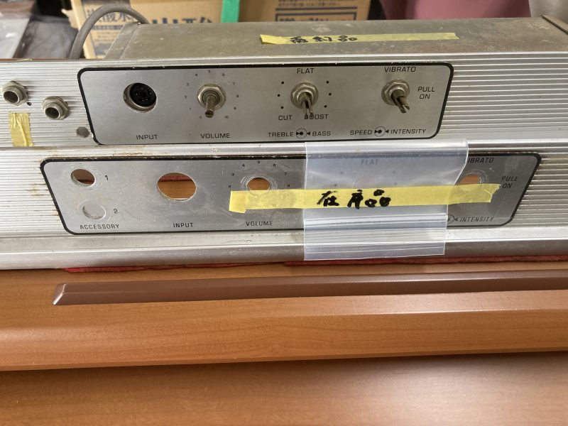 2025.07.18プリアンプの動作確認を行い、一部接触不良と断線が有ったので、修理して問題無く動作するようになりました。ただ、プリアンプのパネルの形状を見ると、当社在庫の物と比べてアクセサリー端子の位置が異なっていました。その為、ハープベースのブロックを削っていたものと推測されます。そうすると、内部の基盤を後付けで取り付けたものと想像されます。