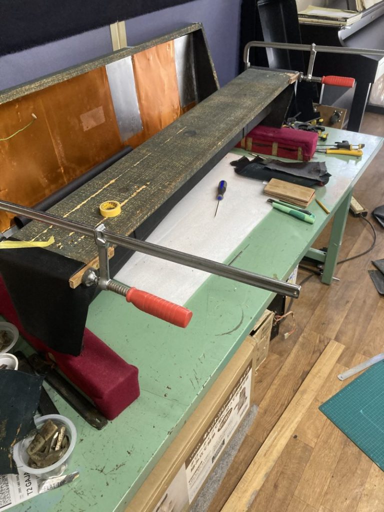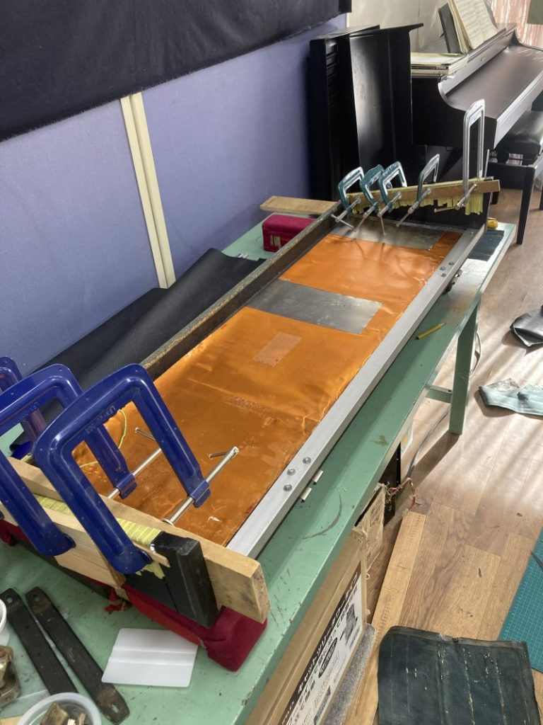 音出し確認が出来た所で、調律、ハープ調整、ボイシング調整等調整作業は最後にして、フタ部分のトーレックスの張り替えを行います。