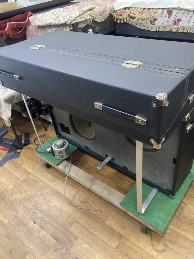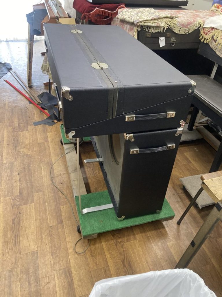 全てが完了したと思ったら、もう一つ悩み事が出て来ました。こちらのフタは上にシンセサイザー等の楽器を載せる為にハーフカットになっています。その為中ブタが欠損していたので、在庫の中ブタを取り付けたらフタが閉まらない。これは仕方無いので、中ブタは取り外した状態で運ぶ事にします。