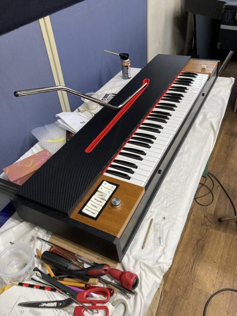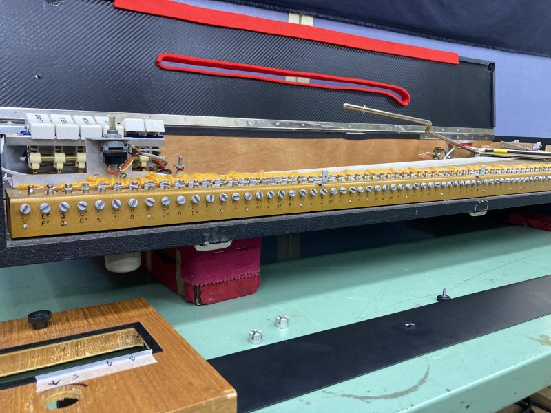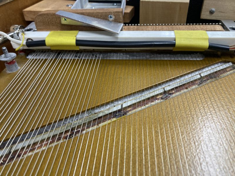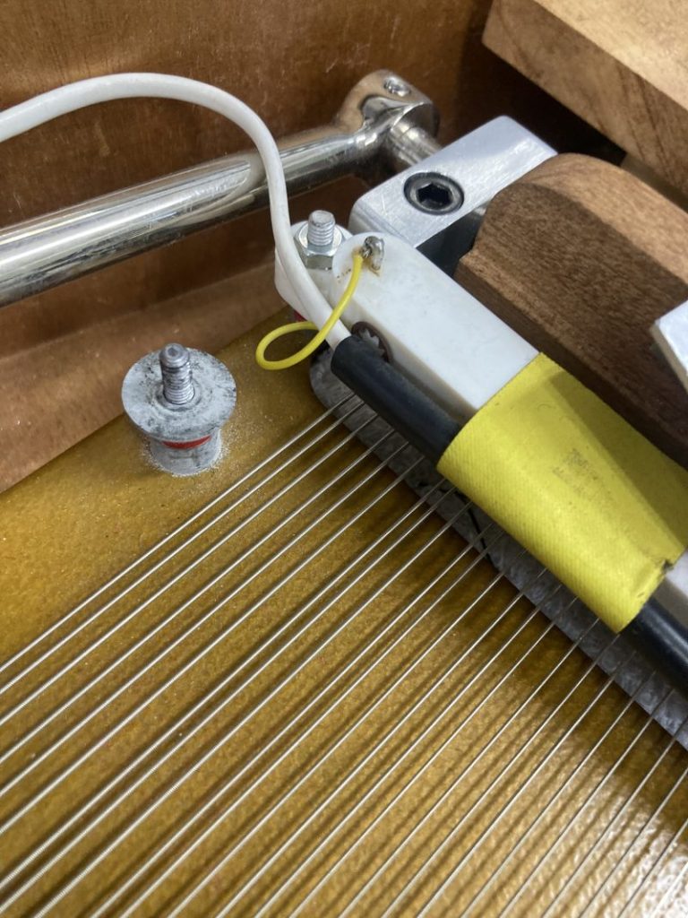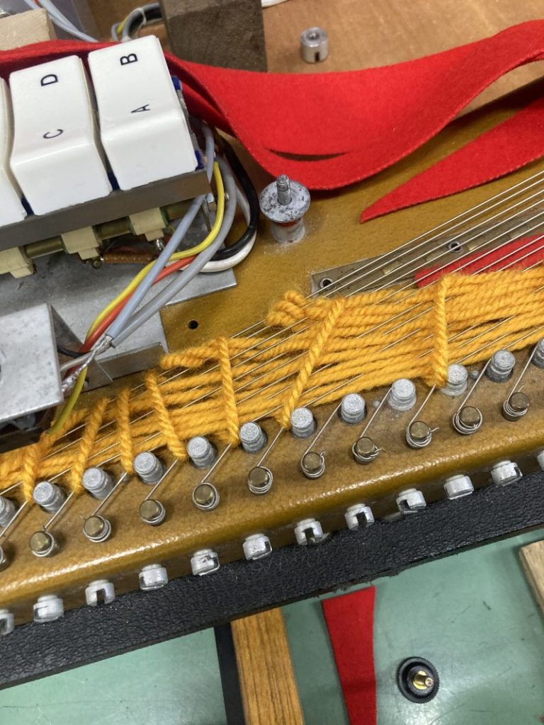 2026.02.19昨日の夜はずうーっとこの止音不良の事が頭から離れず、ピアノに比べて何が違うのかを考えていました。先ず、一番違うのはダンパーが無いと言う事です。ピアノは音が響きすぎないようにダンパーで音を止めています。クラビネットの場合ダンパーが有りませんので、ピアノで言えばダンパーぺダルを踏んだ状態で弾いている事になります。それならばと、ダンパーフェルトを弦の上に乗せて試してみましたが、あまり効果が有りません。