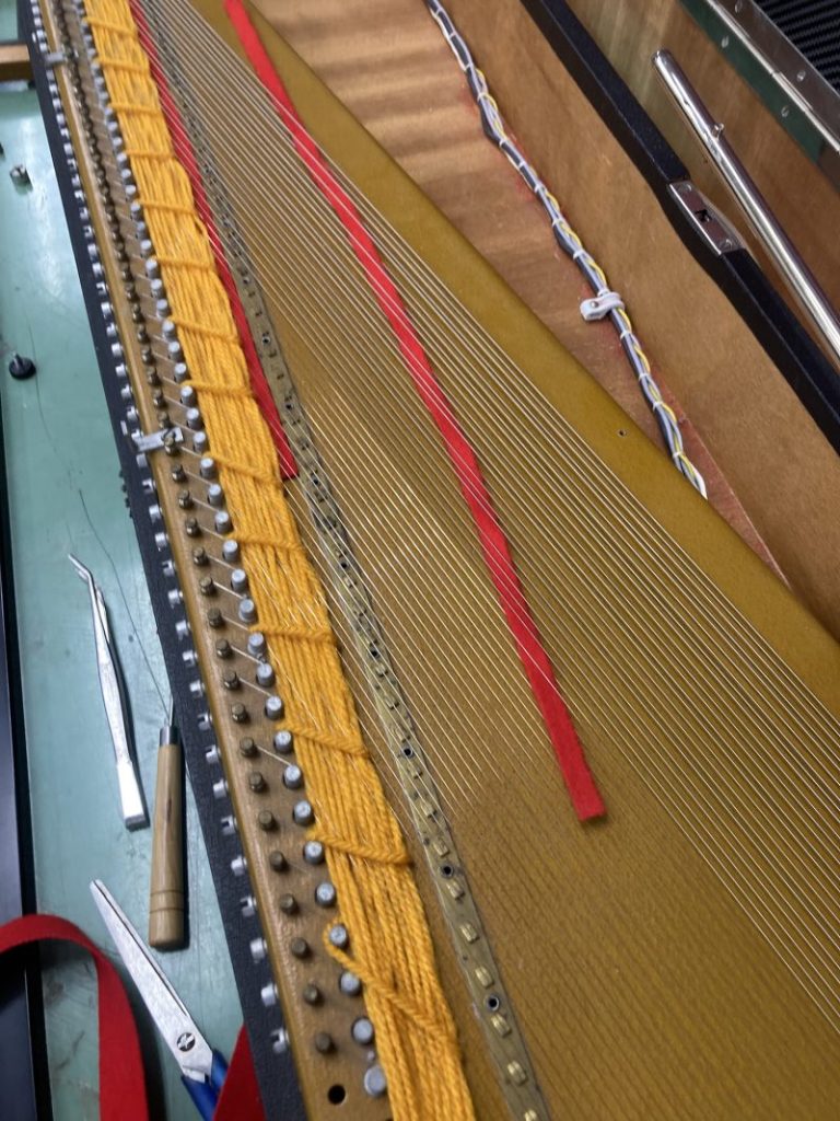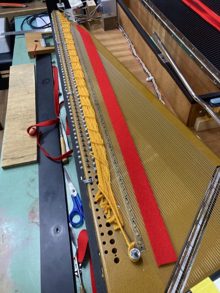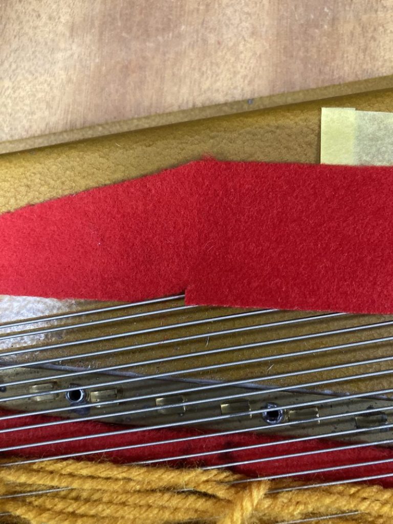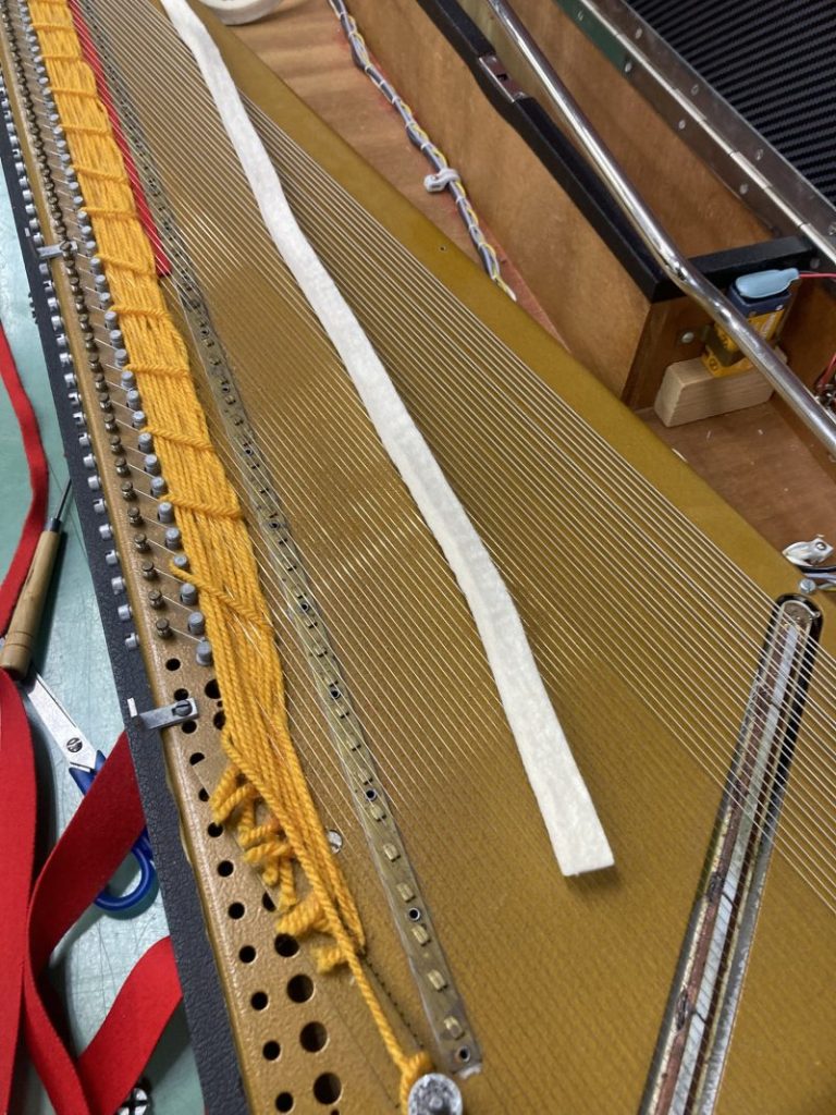 2026.02.18先ずは毛糸を巻き込んでミュートしている弦の下に、1.5㎜のフェルトを差し込んでみました。グランドピアノには、弦枕と言うフェルトを使って、雑音や余分な響きを無くす部品が取り付けて有ります。それを真似てセットして見たところ、やや改善したようにも聞こえるのですが、それでもやはり残響音が残っているように感じます。