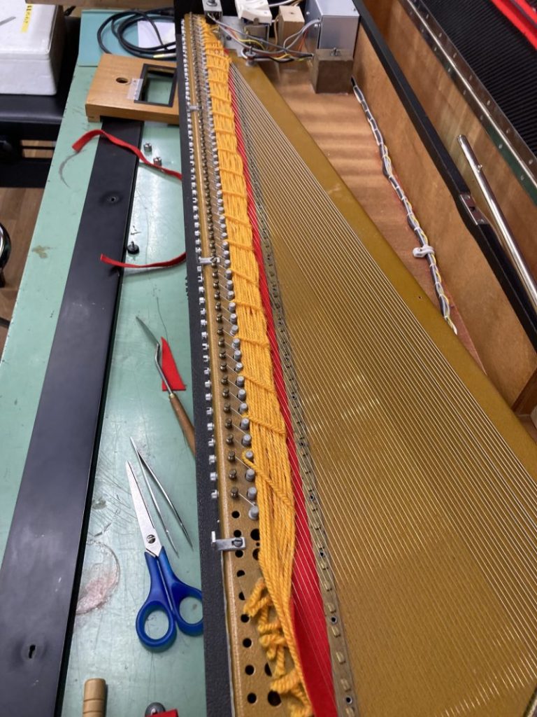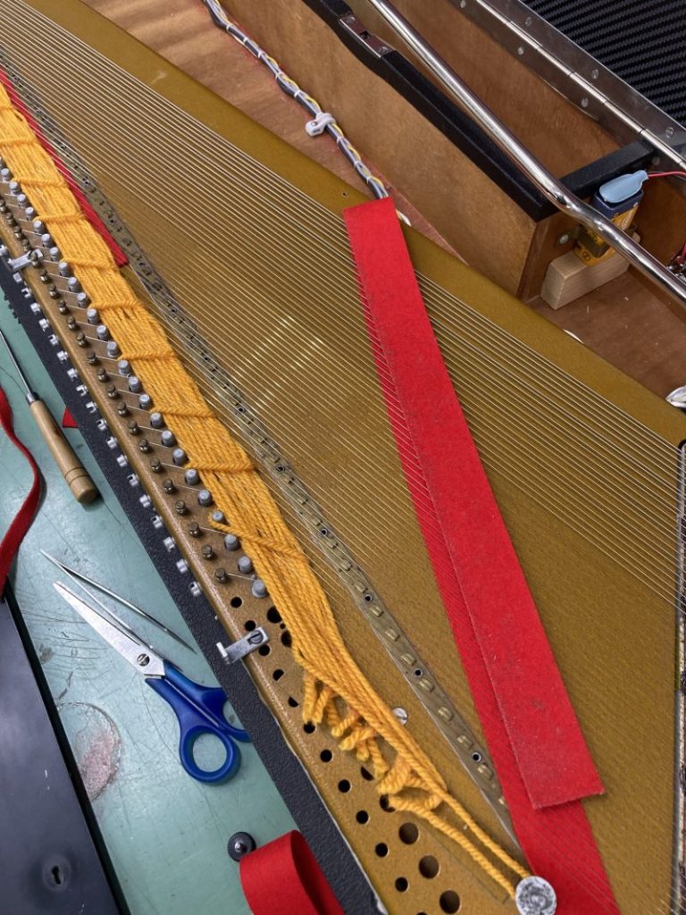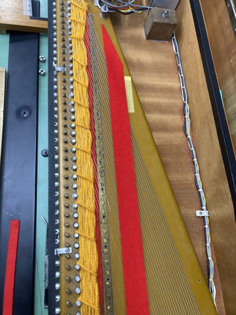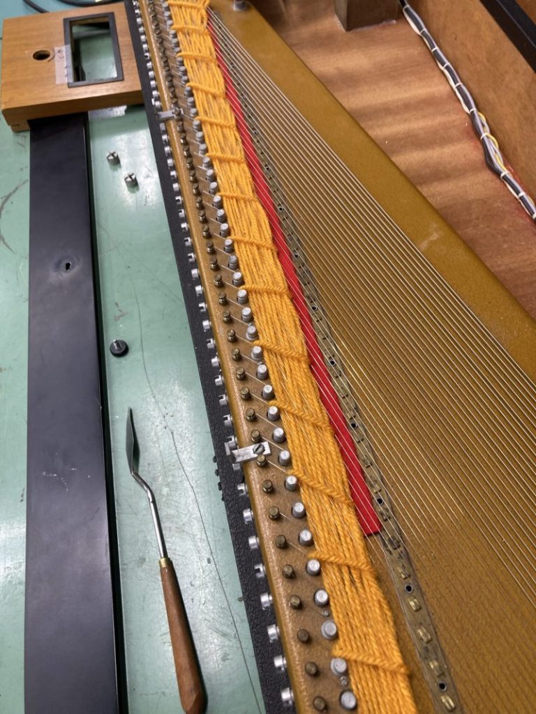 2026.02.18先ずは毛糸を巻き込んでミュートしている弦の下に、1.5㎜のフェルトを差し込んでみました。グランドピアノには、弦枕と言うフェルトを使って、雑音や余分な響きを無くす部品が取り付けて有ります。それを真似てセットして見たところ、やや改善したようにも聞こえるのですが、それでもやはり残響音が残っているように感じます。