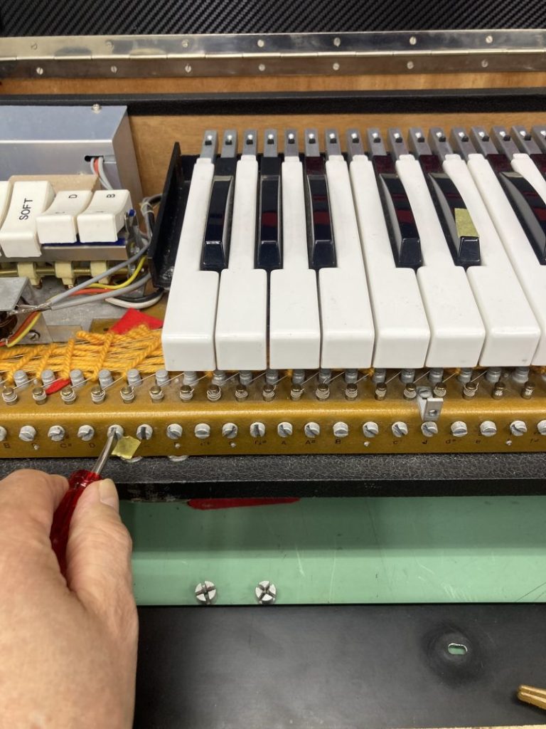 この状態で全体の音出しをしたところ、E♭の音がすっきりしません。チューニングピンを回して、弦の調整もしてみましたが、改善しません。