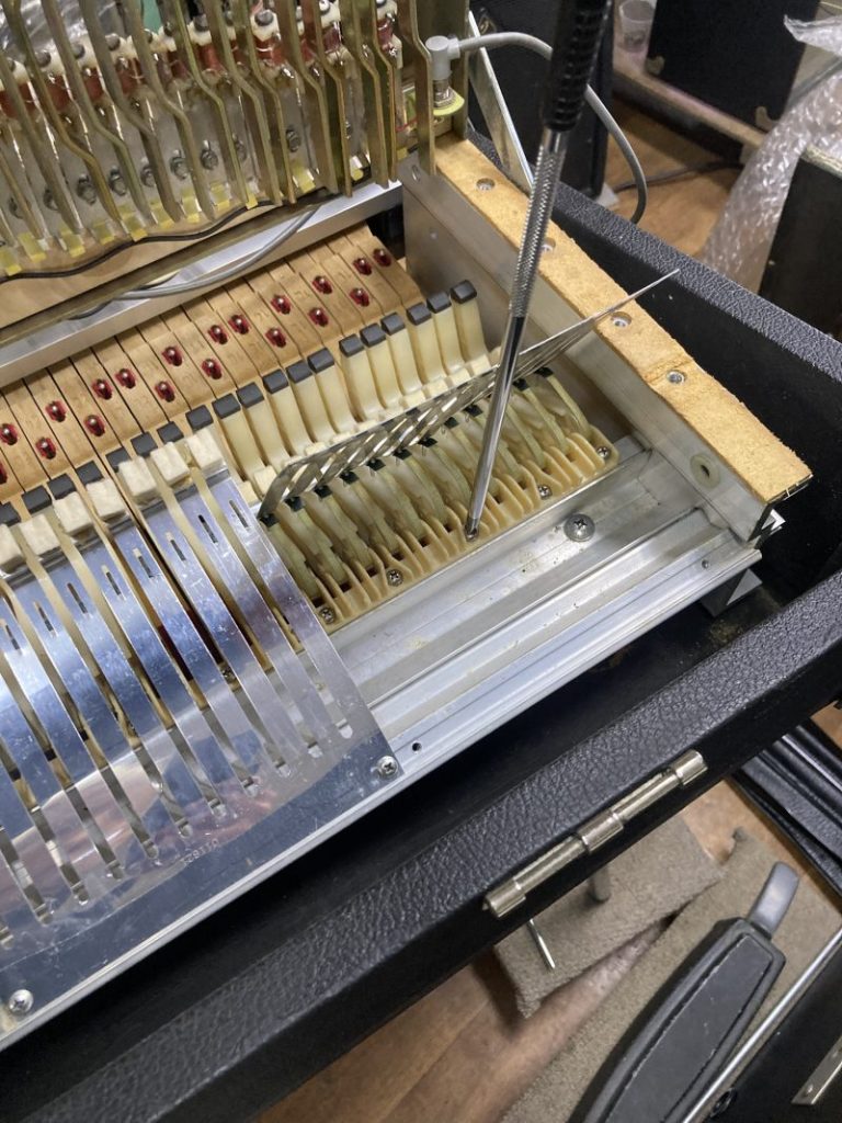 全ての鍵盤をセットしてハープ調整を行いました。ハンマーのアタックポイントが左右にずれている物が有り、その調整に手こずっています。このモデルはMark1でも新しいモデルで、ハンマーの取り付けがブロック毎になっていますので、ハンマーの走りを一つ一つ調整する事が出来ません。その為トーンジェネレーターを調整してアタックポイントを探る事になります。これが中々しんどい作業で、一度良かったと思っても、何回か打鍵しているうちにポジションが変化してしまいます。少々時間がかかる作業となりそうです。また、当初大丈夫だったピックアップが飛んでいる物が幾つか出て来ました。ハンダの熱によるものかと推測しますが、まだ延々と作業が続きそうです。