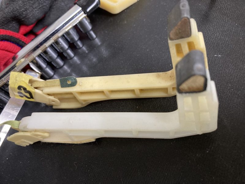 その後ハンマーとダンパーのユニットを取り外しました。新たに取り付けるハンマーも一緒に置いて、不具合が無いか確認した所、パーツが足りない事が分かり、急遽取り外したハンマーを成形して使う事にしました。